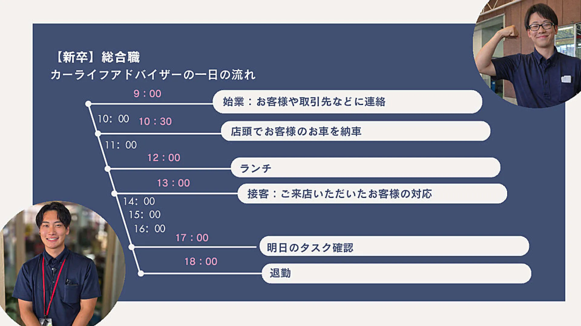 野口自動車がどのような会社であるのかの説明だけでなく、実際の働く現場をイメージしていただけるように、営業店舗との中継をつないでリアルな現場を紹介しています。